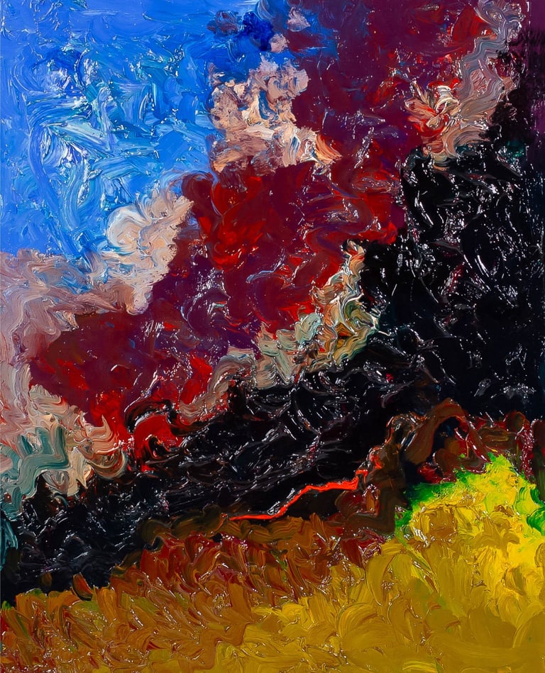 Após pesquisas com os tons do Cerrado pós-queimada, criei Raízes do futuro. Ela é inspirada na força renovadora do fogo natural do bioma e foi preciso inúmeras camadas para atingir a tonalidade de preto que eu havia projetado para a tela.