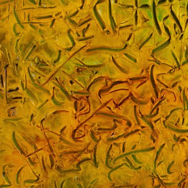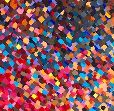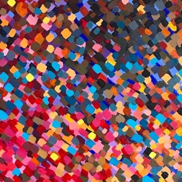 Neste eixo, a pesquisa se concentra na cor enquanto fonte de organização da matéria. Partículas, pontos, quadrantes e repetições constroem uma linguagem visual que investiga a cor como substância viva e relacional. A repetição obsessiva, longe da mecânica, opera como método de escuta: cada variação mínima ativa tensões entre ordem e instabilidade, formando superfícies onde o visível se aproxima do microscópico e do cósmico.